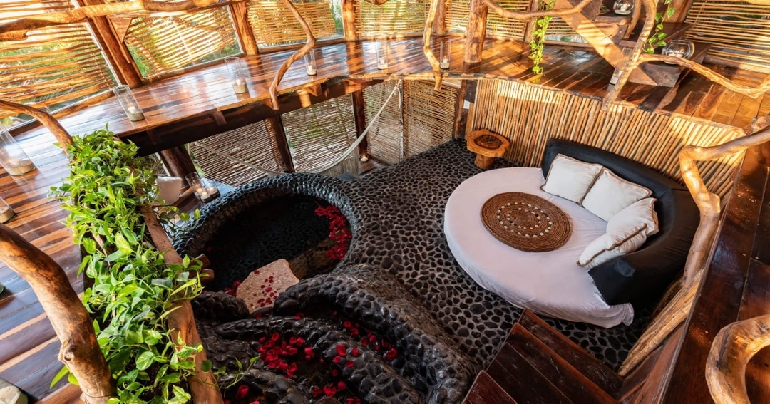 Surrounded by lush vegetation, it merges with the natural rhythm of the jungle.